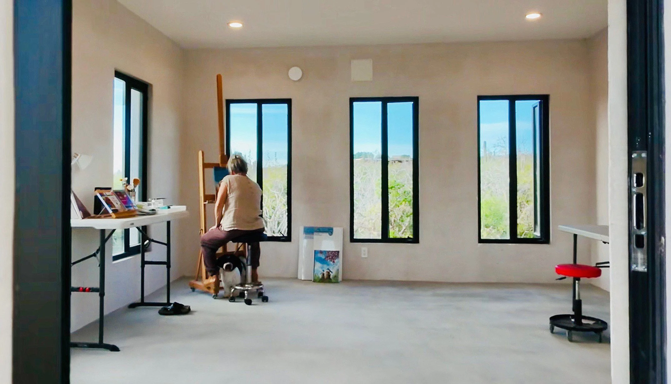 Each studio is 30 square meters of light and creative energy. Each studio is an off-grid, day-use sanctuary designed to nurture inspiration from the adjacent desert and ocean’s edge. The surrounding desert silence, cacti, mountain and ocean views are perfect for introspection and meditative creation.